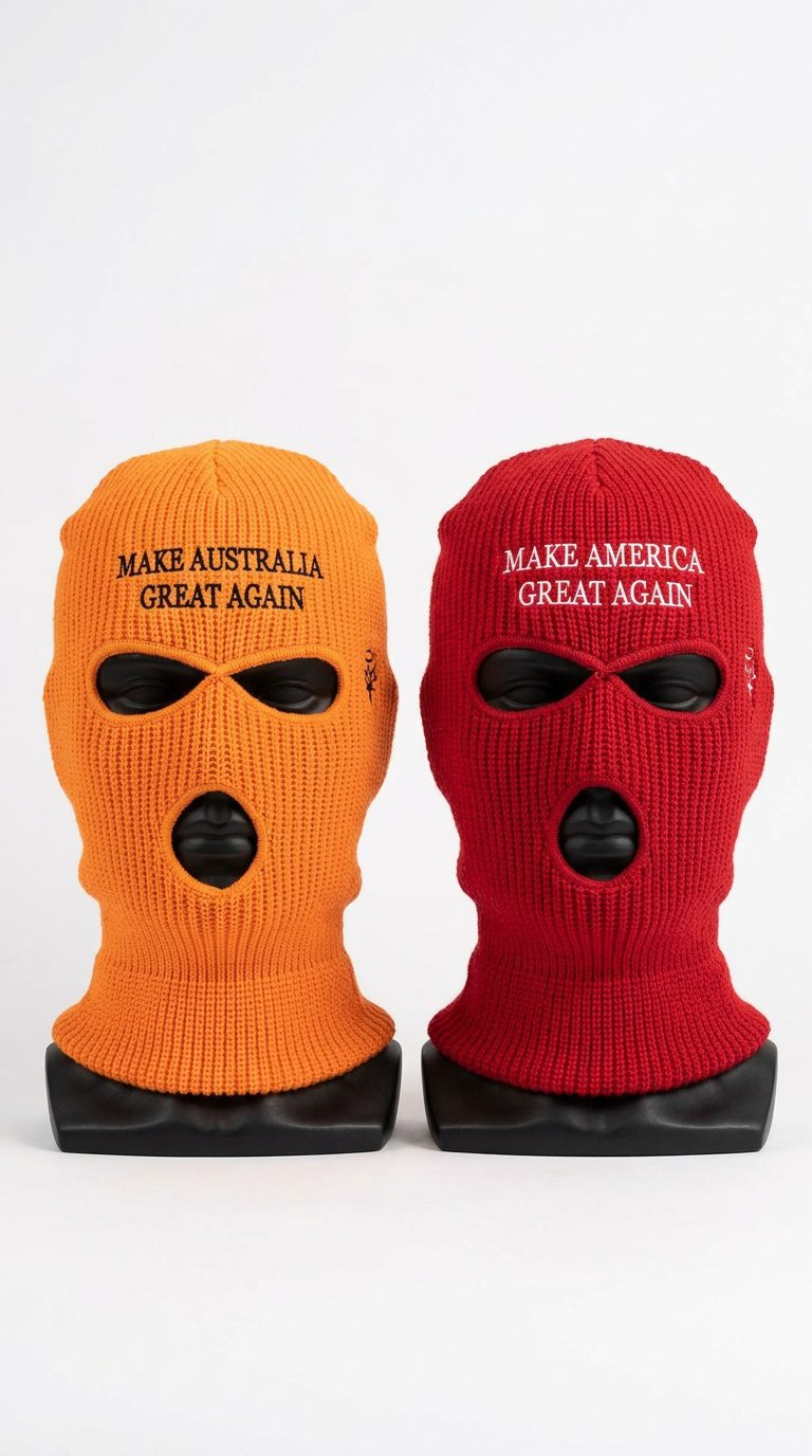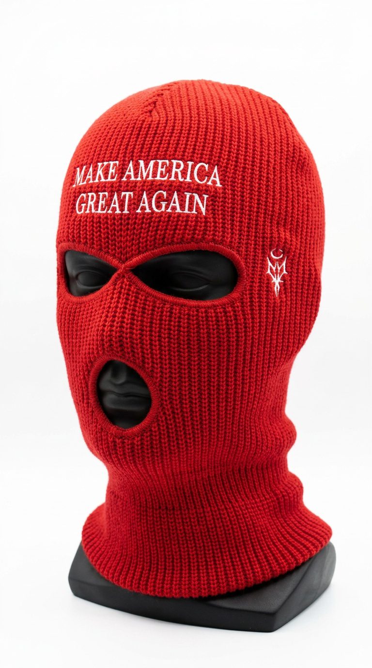 Heavyweight knit balaclava with a structured fit and premium embroidery in two colourways built from political identity:
